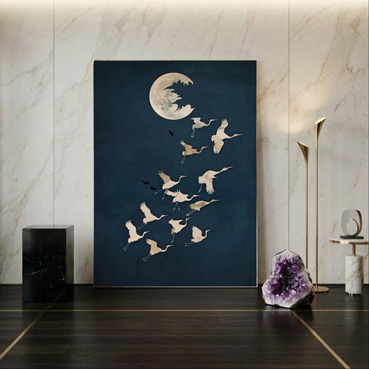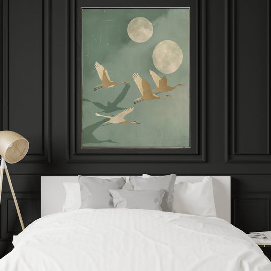 Flying Cranes Moon Framed Wall Art Canvas Print - Japandi Sage Artwork