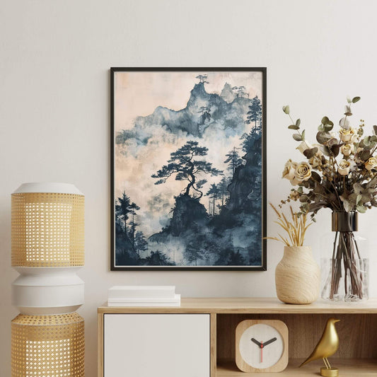 Misty Pine Mountain Framed Wall Art Canvas Print - Asian Nature Landscape Artwork