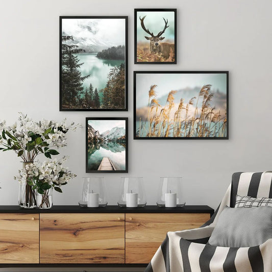 Autumn Panoramic Landscape Canvas Print Nordic Elk Hill Green Lake Wilderness Posters Gallery Wall Art Set Of 4 Posters For Modern Living Room Home Decor