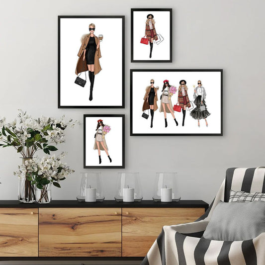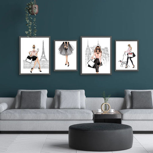 Paris Fashion Shopping Girl Canvas Prints Minimalist Nordic Style Elegant Woman Gallery Wall Art Set Of 4 Posters For Modern Girl Living Room Home Decor