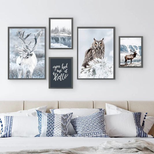 Winter Snow Deer Owl Forest Wilderness Canvas Prints Nordic Gallery Wall Art Set Of 5 Posters For Rustic Living Room Home Decor