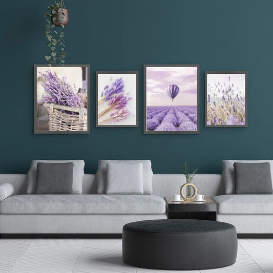 Dreamy Purple Lavender Landscape Hot Air Balloon Nature Canvas Prints Gallery Wall Art Set Of 4 Posters For Modern Living Room Home Decor