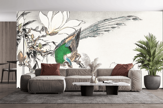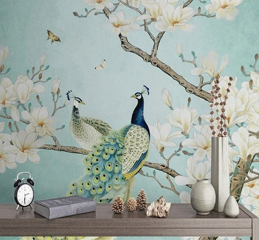 Chinoiserie White Magnolia Flowers and Peacock Mural Wallpaper (SqM)
