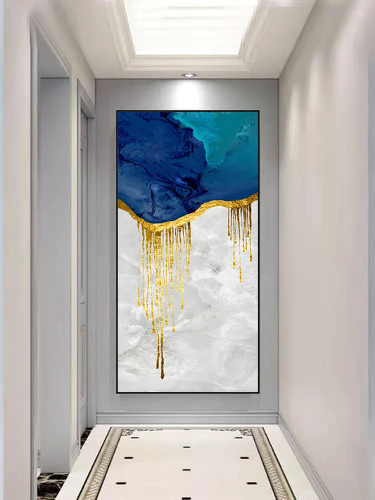 Aqua Blue Liquid Golden Wall Art Canvas Print Vertical Format Poster For Living Room Bedroom Modern Wall Art Interiors