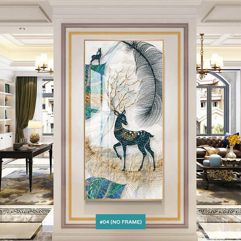 - Auspicious Abstract, Mystical Landscape, Feathers, Deer, Butterflies, Pictures For Luxury Living Room, Vertical Format Wall Art, Blue Jade Golden, Boutique Hotel Décor.