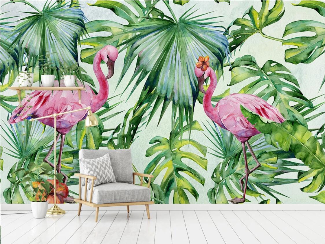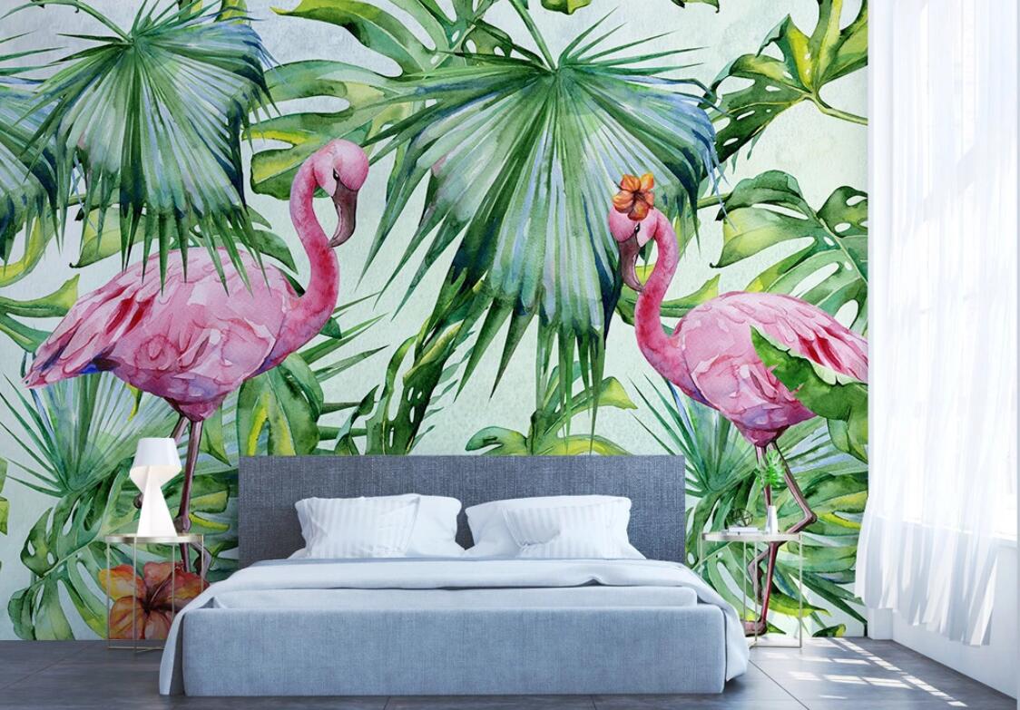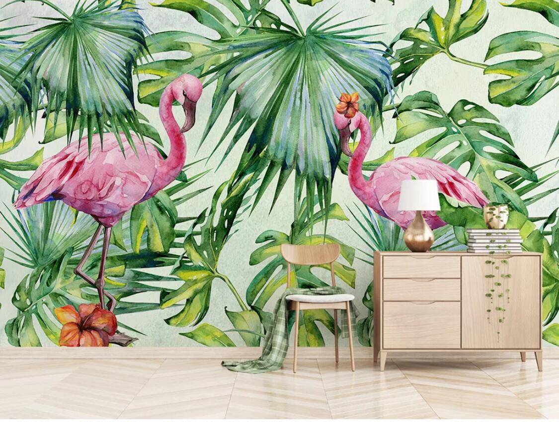The Flamingo Couple under the Tropical Leaves Mural Wallpaper is an artfully designed mural that helps you create a naturally calm environment and bring a feel of life in your living space. Our nature inspired wallpapers can transform any space. Use it in your living, lounge, bedroom, dining room. Custom-made wall mural, price by SqM.