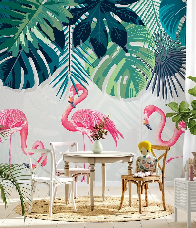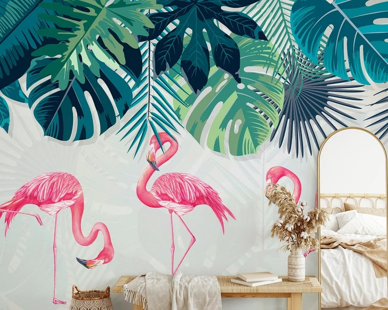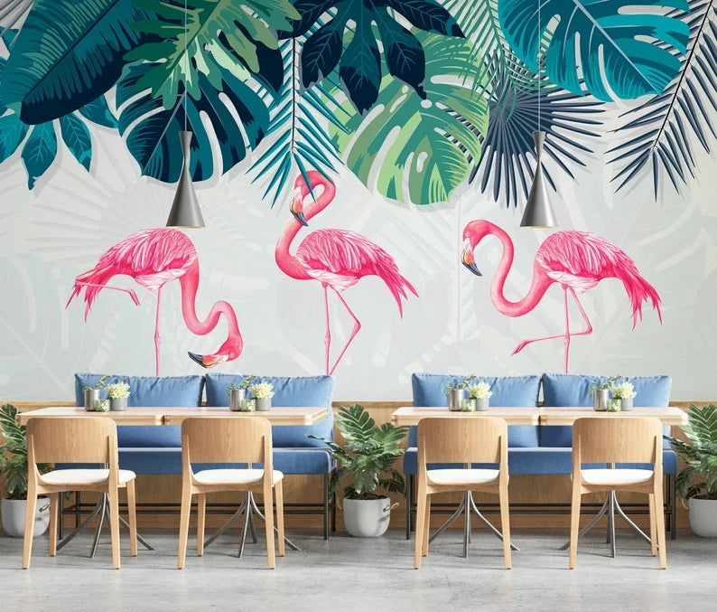 The Flamingo under the Tropical Leaves Mural Wallpaper is an artfully designed mural that helps you create a naturally calm environment and bring a feel of life in your living space. Our nature inspired wallpapers can transform any space. Use it in your living, lounge, bedroom, dining room. Custom-made wall mural, price by SqM.