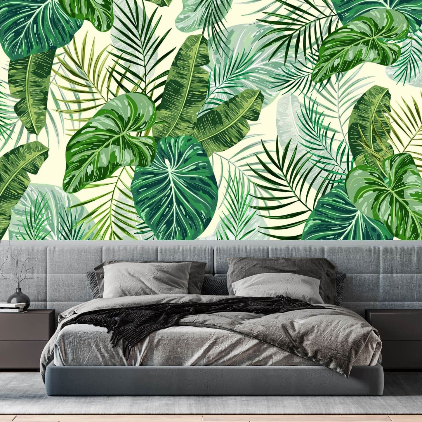 Create a beautiful, elegant space in your home with a stunning tropical leaves mural wallpaper. This botanical wallpaper will add an elegant and sophisticated feel to your home. The charming leaf design will create a romantic look and will make a beautiful accent wall whether in the living room, bedroom or in the dining room.