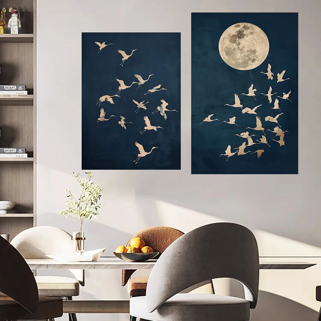 Inspired by Japandi design principles, this minimalist bird wall art unites Japanese spiritual symbolism with Scandinavian simplicity. The crane, a symbol of longevity, harmony, and wisdom, is elegantly rendered in soft contrast with the night sky and moonlight, making it a grounding piece for your Zen living room, meditation space, or minimalist bedroom.