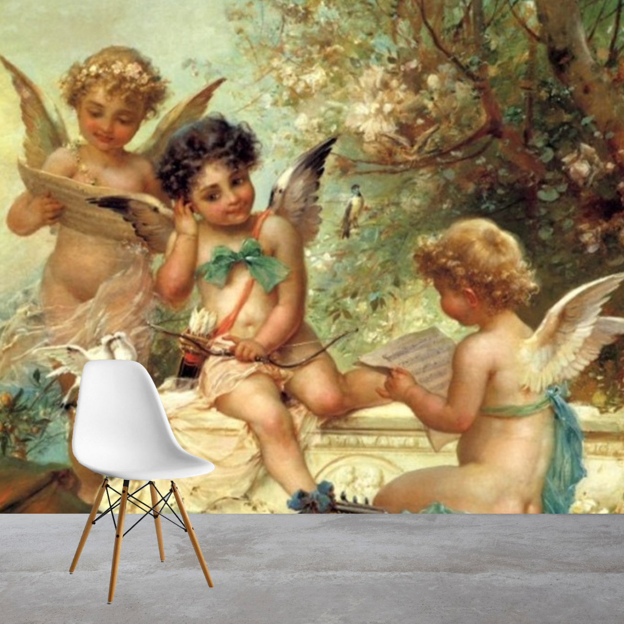Bring a sweet and tender piece of art into your interior with the Little Angels Wall Mural featuring paradisiacal motifs. The sweet little angels wallpaper is a stylish and guaranteed eye-catcher for any space.