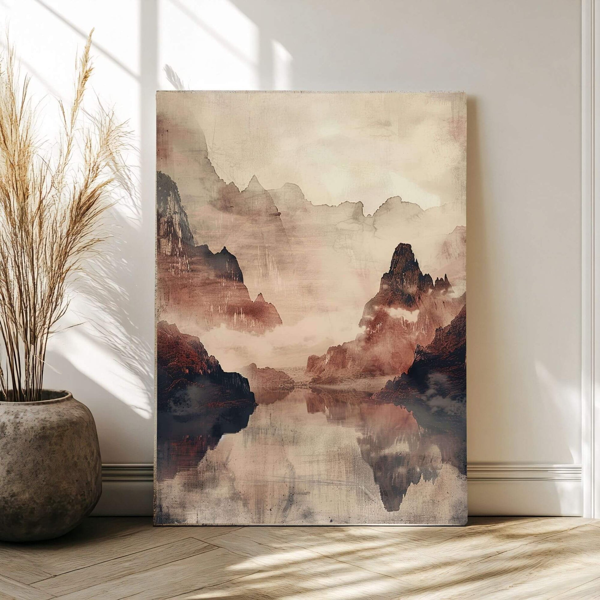 The Mountain Reflection Landscape Japandi Wall Art Canvas Print captures a calm natural scene where distant mountains meet their reflection on a still surface of water. The symmetrical composition creates visual balance, while soft atmospheric tones introduce depth and tranquility.