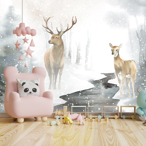 This cartoon winter landscape wallpaper mural will bring the feeling of joy to your home. It design features a hand-painted winter wonderland in snow and a pair of deer. Perfect for creating a joyful and welcoming space, this winter wonderland wallpaper mural will look amazing in your bedroom, living room, nursery or kids.