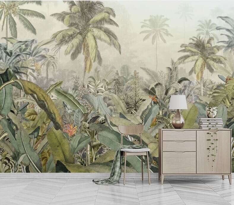 This gorgeous green tropical forest mural wallpaper will surely add the natural beauty of the outdoors to any living space. A beautiful luxuriant tropical wallpaper to decorate a living room, bedroom, office or another living space of your choice.
