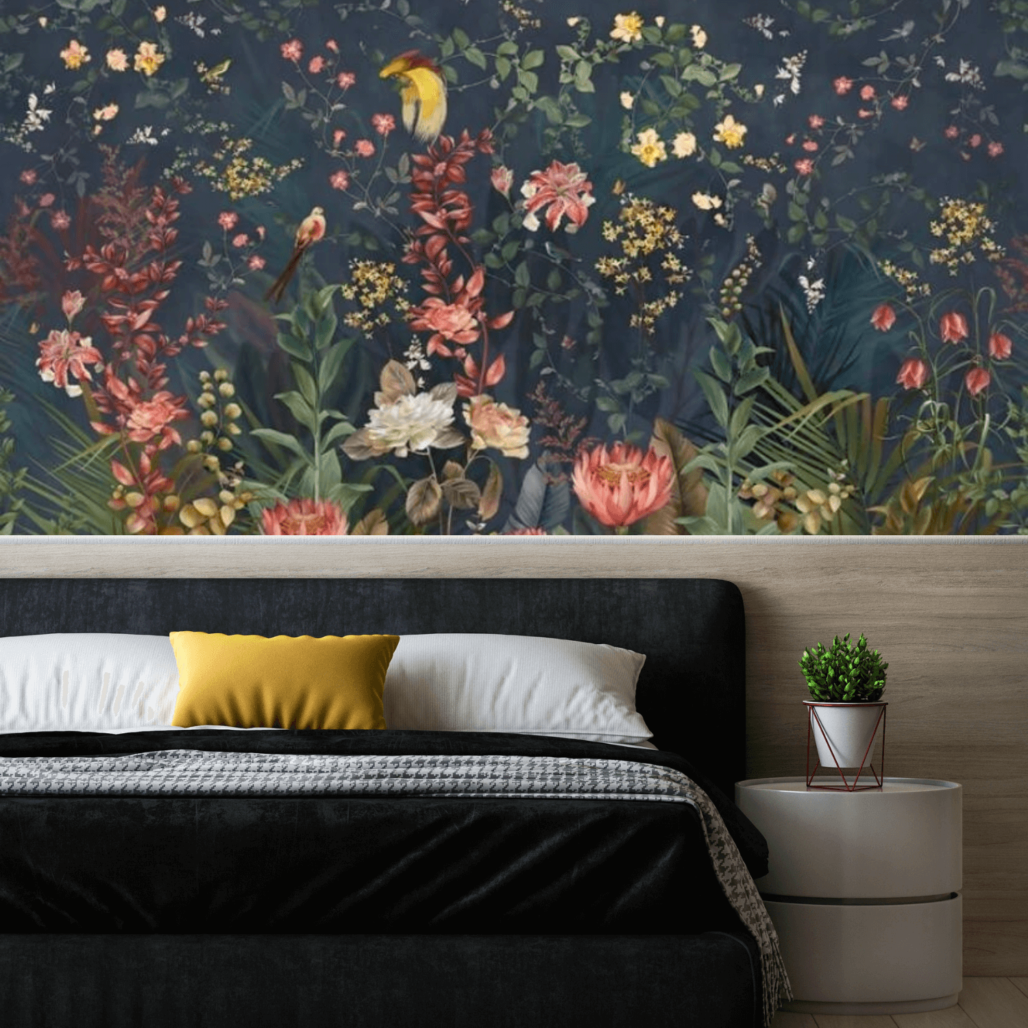 Beautiful blossom flowers artfully captured on a black background. This floral mural wallpaper will add a mysterious touch to any space - living room, bedroom, lounge, bathroom, kitchen. Custom-made wall mural, price by SqM.