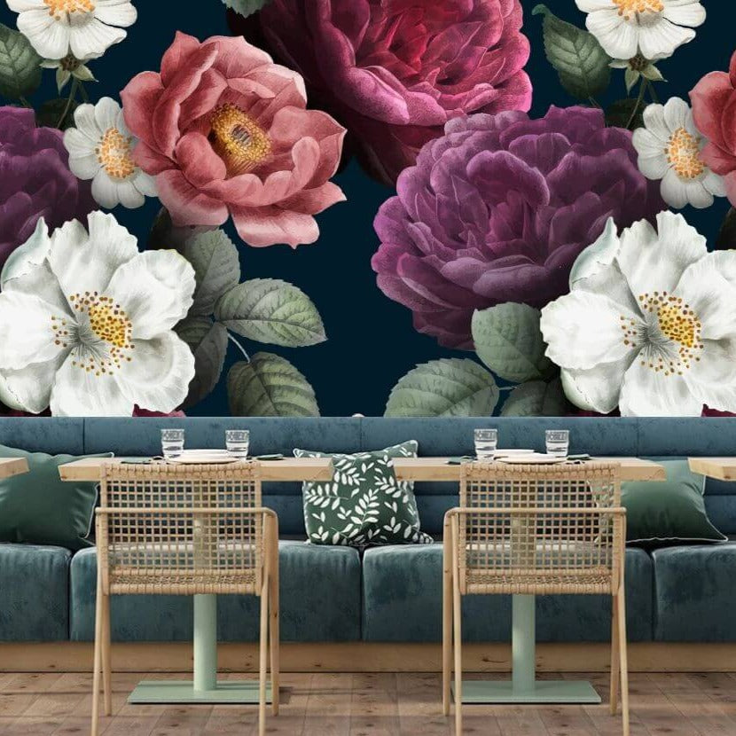 Create a beautiful, elegant space in your home with our beautiful spring floral mural wallpaper. This stunning dark flowers wallpaper will add an elegant and sophisticated feel to your home. The charming floral design will create a romantic look and will make a beautiful accent wall whether in the living room, bedroom or in the dining room.