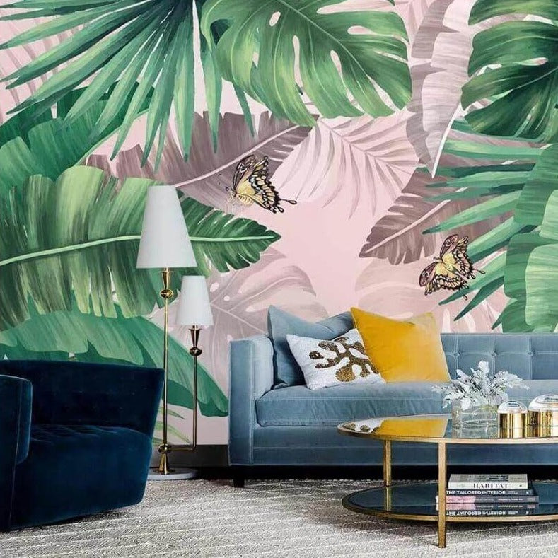 This gorgeous green tropical plants mural wallpaper will surely add the natural beauty of the outdoors to any living space. A beautiful luxuriant green wallpaper to decorate a living room, bedroom, office or another living space of your choice.